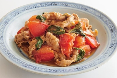 3.トマトを加え、強めの中火にして残りの焼肉のたれも加える。トマトの皮が少し縮むまで30秒?1分炒めたらしそを入れ、さっと混ぜる。