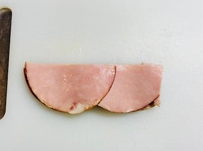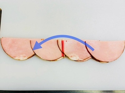 3.切ったハムの上半分をパタンと折りたたむようにして、下半分のうえに重ねます。