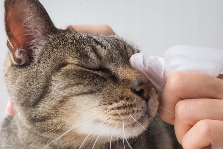 猫が顔を洗っているときに自然にとれたり、自分で取っていることが多いようですが、目やにが残っている場合や気になるときにはガーゼやティッシュなどで優しく猫の目やにを取ってあげましょう。