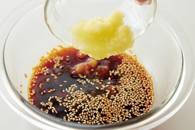 1.ボウルに醤油、全部混ぜわせたA、白ごま、すりおろしりんごを入れ(上写真)よく混ぜる。