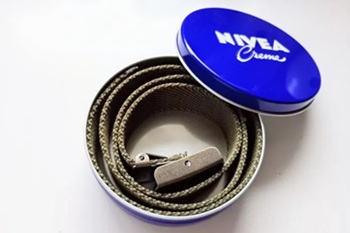 たとえば女性用の細いベルトなら、ちょうど1本が青缶の中にすっぽり収まります。缶が保護してくれるため、たんすの引き出しに入れても型崩れしません。