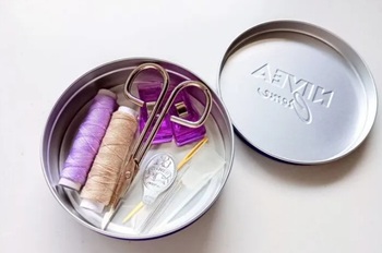 ニベア青缶に手持ちの裁縫道具を入れてみると、最低限のアイテムが揃ったソーイングケースになりました。