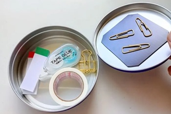 ふせんやダブルクリック、テープのりをひとまとめに。マグネットシートのフタにクリップをくっつけておけば、サッと使えて便利です。