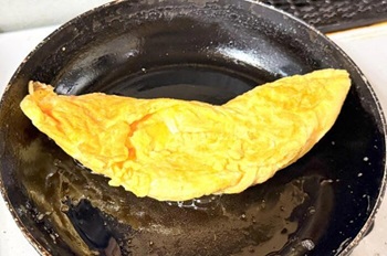 ところが、裏ワザを使ったあとはびっくり!古いフライパンなのに、まったくこびりつかず、きれいな卵焼きが完成しました!