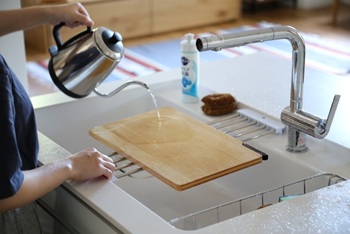 さらに注意してほしいのが、肉や魚を切ったあと、すぐにまな板に熱湯を流しかけることです。
