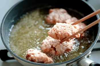 肉や魚を使った厚みのある食材を揚げるときには、多めの油を使い、一度にたくさんの量を揚げないようにしましょう。