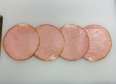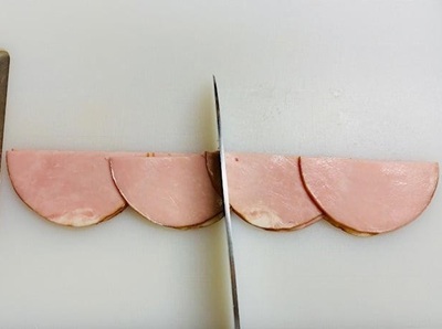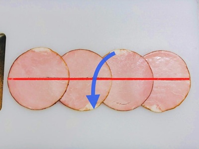 3.切ったハムの上半分をパタンと折りたたむようにして、下半分のうえに重ねます。