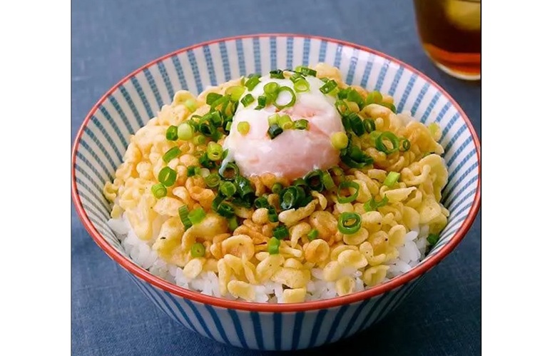 ご飯へ揚げ玉を乗せて、タレをかけます。